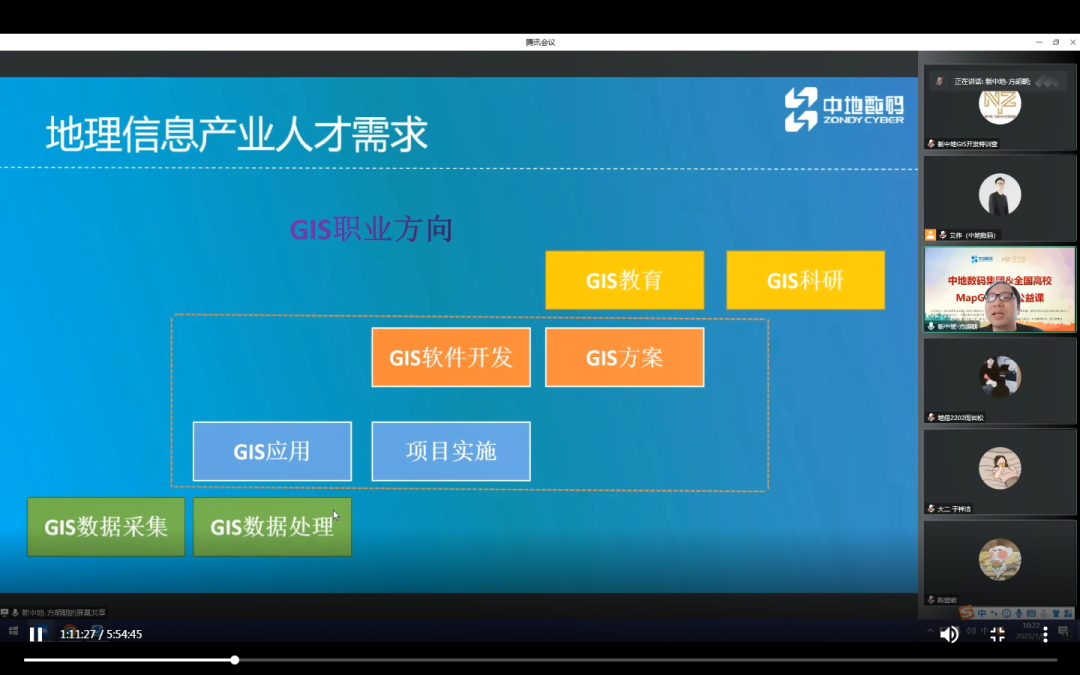 为贯彻和落实国家中长期人才战略目标,推动地理信息产业快速发展,大力培养有创新精神与创新思维的GIS领域复合型人才,强化学生对GIS理论结合实际的应用能力,2023年1月7日-8日,中地数码集团联合中国矿业大学、电子科技大学、武汉大学、中南大学等20多所国内GIS重点院校开展MapGIS应用公益课,参加学生人数达千人,通过本次公益课,充分发挥高校、企业双方的理论知识、实践教学、项目资源优势,助力高校学科建设!公益课开班仪式本次活动得到了国家地理信息系统工程技术研究中心、地理信息系统产业技术创新战略联盟、地理空间信息技术国家地方联合工程实验室、高校GIS论坛、全国高校GIS技能大赛的大力支持,由中地数码集团、新中地教育主办。1月7日,中地数码集团联合高校MapGIS应用公益课开班仪式隆重举行!中国矿业大学环境与测绘学院教学副院长周来副教授、中地数码集团新中地教育总经理徐国华、新中地教育高校合作部艾伟老师、中地数码地理信息工程高级工程师、注册测绘师郭有世老师作为校企嘉宾代表在线上参加本次开班仪式,新中地教育高校合作部艾伟老师担任主持。中地数码集团、新中地教育总经理徐国华致辞中地数码集团、新中地教育总经理徐国华代表企业方致辞,他讲到:精耕行业30余年,中地数码始终保持自主核心技术的领先地位,拥有自主可控且具有国际竞争力的国产MapGIS平台软件,践行着产业报国的社会责任。中地数码在企业发展中,作为中国地质大学(武汉)教授的集团创始人刘永、吴信才老师在GIS人才培养方面,实施了GIS人才战略,同时为GIS产业培养了大批创新型、应用型人才,从而创建了新中地教育。中地数码集团与国内众多高校开展了形式多样的校企合作,组办全国高校GIS论坛、举办全国高校GIS技能大赛,与国内近200所高校共建了GIS实验室,与中国矿业大学、电子科技大学、中南大学、武汉大学、中国地质大学(武汉)、华中农业大学、湖北大学、云南师范大学、武汉理工大学、云南大学等50多所高校先后开展GIS开发联合实训、GIS开发特训营实践教学项目。中地数码通过新中地教育,甄选专业性强、经验丰富的工程师参与企业级实践教学,通过“非智力因素+信息技术+专业技术”三位一体的中高端人才培养模式,来启发、引导、发掘、培养和推荐优秀人才,已为行业输送近千余人,本次活动开展是中地数码集团践行校企共同赋能GIS人才培养的重要举措。中国矿业大学环境与测绘学院教学副院长周来副教授作为校方代表领导嘉宾致辞,首先,周来院长肯定了中国矿业大学环测院与中地数码集团、新中地教育联合举办的GIS专业应届毕业生实习实训,为校企合作联合育人工作拉开序幕!他强调:矿大环测院将与中地数码集团共同积极探索创新校企合作模式,丰富校企合作内容,充分发挥高校、企业各方的理论知识、实践教学、项目资源优势,助力高校学科建设,将课堂理论知识灵活运用到实际应用中,锻炼学生的动手实操能力,为同学们未来学业、考研、就业奠定实践基础,同时,向企业输送符合市场需求的优质GIS学生。最后,周来院长预祝本次活动举办圆满成功!中国矿业大学环境与测绘学院教学副院长周来副教授致辞随后,带着校企双方共同的期待,MapGIS应用公益课教学正式开启!中地数码地理信息工程高级工程师、注册测绘师郭有世老师主讲,他按照国家GIS教育培养方案,对接社会GIS人才需求,并根据实际情况定制了培训课程,主要课程内容包括MapGIS for Desktop软件安装与数据管理、软件基础应用与操作、软件地图制图、软件三维建模等,重点聚焦于如何利用全国产化平台MapGIS进行项目应用实操等。培训过程中,郭老师讲解遵循循序渐进、因材施教的原则,采用“讲解+实操”的方法,既学既练。培训课在内容上,从MapGIS产品桌面端点线区编辑的简单操作到如何整饰出图等常规操作,再到饱含技术干货的三维建模,层层深入,让参与培训的学生多维度学习、熟悉软件基本操作,本次培训不仅加强了学生对理论知识的巩固吸收,也切实锻炼了其实践能力,为在校学生提供一次难得的实践学习的良机!知识点讲解实践操作讲解 1月8日,国家地理信息系统工程技术研究中心副秘书长、中地数码集团人才培养中心方胡朝主任为同学们带了一场名为《GIS行业技术应用与发展、未来择业指导》行业认知讲座,从行业头部企业中地数码集团的视角全面介绍GIS行业发展历程及现状、前沿技术及发展趋势、实际场景应用案例解析等内容,助力学科建设;同时,对于GIS专业同学个人发展,从考研和择业等维度给予专业分析和指导建议,帮助同学们更好规划个人发展道路。行业认知讲座未来,中地数码集团、新中地教育将持续与各高校联合开展GIS实践教学活动以及形式多样的校企联合育人项目,共同为学校GIS专业学科建设赋能,为创新型、应用型GIS人才培养贡献企业力量!
