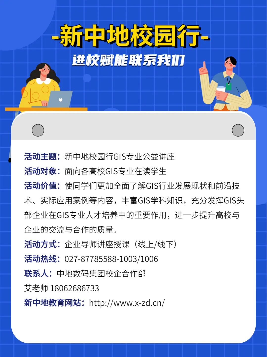 为了让各高校GIS专业学生更加全面了解行业发展现状和前沿技术、实际应用案例等内容,丰富GIS学科知识,进一步促进高校与企业的交流与合作,充分发挥中地数码集团在GIS专业人才培养中的重要作用,“新中地校园行”11月18日19:30相约桂林理工大学,通过空中直播课,从行业头部企业中地数码集团的视角全面介绍GIS行业发展历程及现状、前沿技术及发展趋势、实际场景应用案例解析等内容,助力学科建设;同时,对于GIS专业同学个人发展,从考研和择业等维度给予专业分析和指导建议,帮助同学们更好规划个人发展道路。