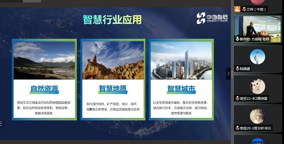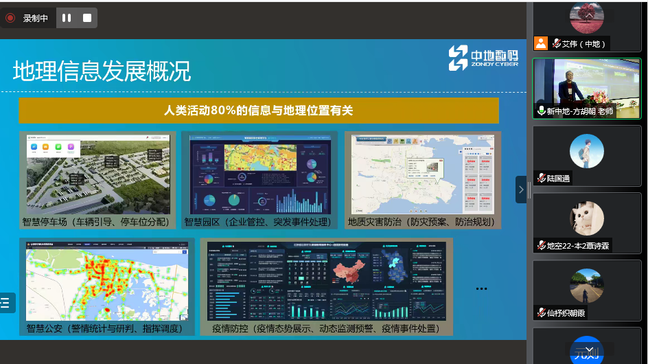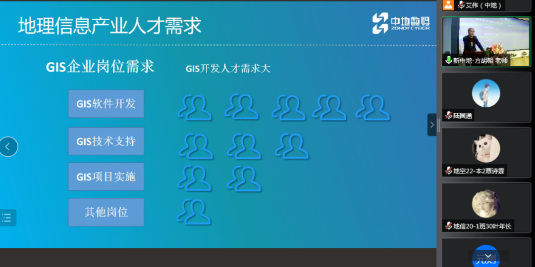 本期新中地校园行讲座活动邀请桂林理工大学南宁分校土木与测绘工程系李卫宁副主任担任校方嘉宾,国家地理信息系统产业技术创新战略联盟副秘书长、中地数码集团新中地教育主任方胡朝主讲《GIS行业发展及应用和择业专题沙龙》,新中地教育高校合作部艾伟老师担任主持,本期线上公益讲座吸引来自本校上百名GIS相关专业同学积极参与线上学习。