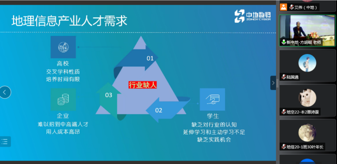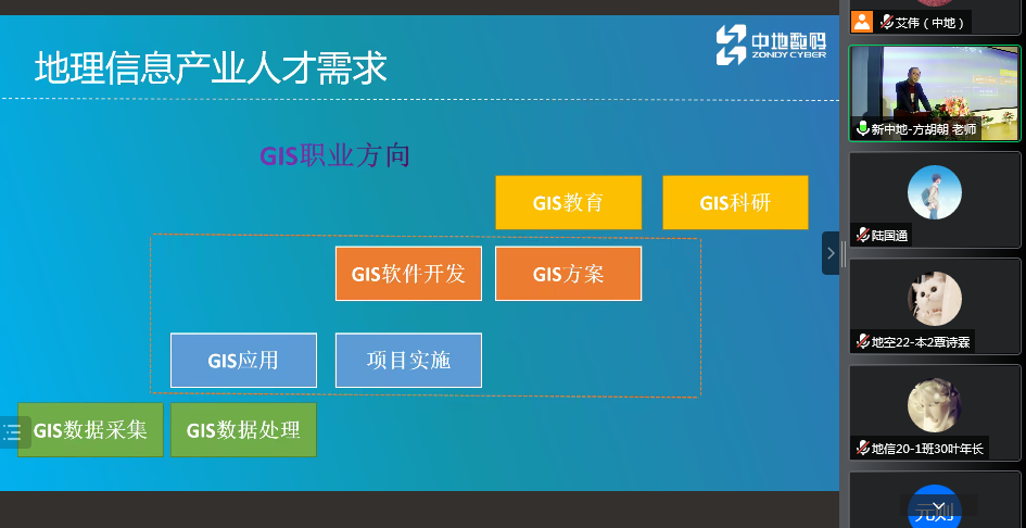 在讲到GIS行业人才职业规划,方主任介绍:企业面向GIS相关专业的毕业生,提供的岗位较多,特别是GIS开发岗,人才需求巨大,在校期间,同学们在掌握GIS理论知识的同时,也需要掌握计算机编程知识,将计算机编程技能与GIS结合,参与企业实践或项目开发实践,不断提升GIS开发能力,为以后就业打下扎实基础。